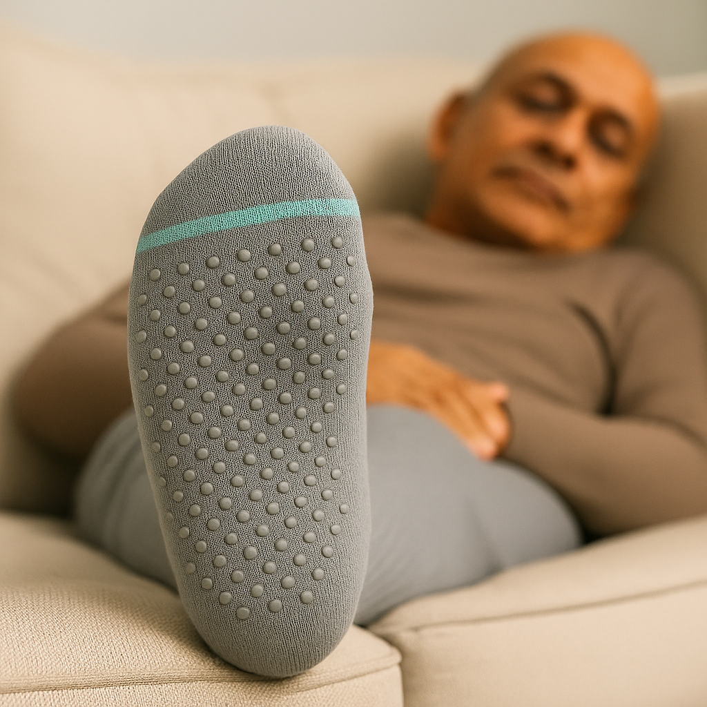 "Within two nights of wearing the SureStep™ socks, the swelling in my legs noticeably reduced and walking to the bathroom at night feels safer. The bamboo fabric is soft, breathable, and never too tight. I actually sleep with them on. It’s comforting to wake up with lighter legs and zero slips. Truly a relief for anyone dealing with nocturia or leg fatigue."